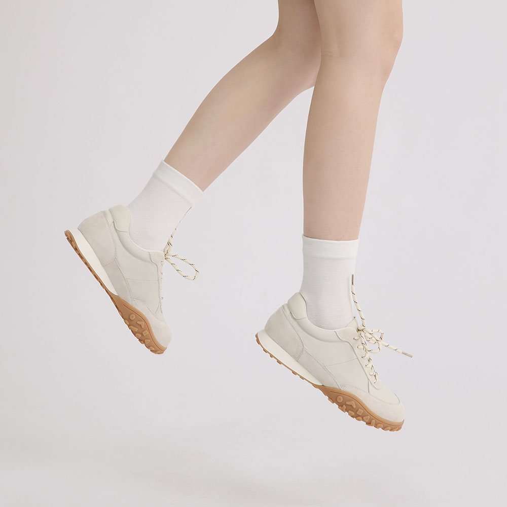 經典的阿甘鞋型在 2026 年迎來機能進化,完美融合復古美學與現代舒適。米白與灰色的中性色調展現出高級的極簡質感,非常適合搭配工裝褲裙或運動套裝,營造率性自然的街頭風格。