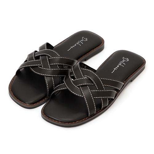 海島渡假.草編麻花設計平底涼拖鞋 時尚黑