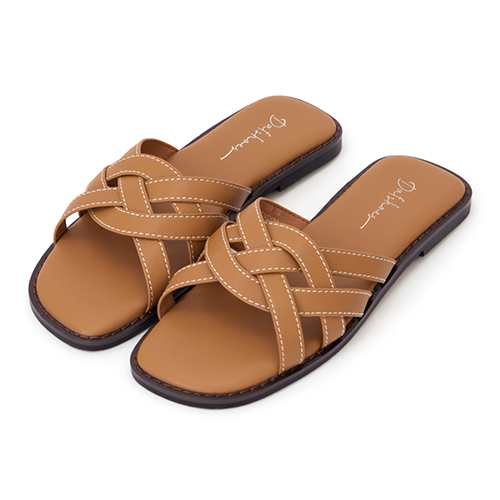 貴婦下午茶.草編拼接馬銜釦平底拖鞋 潮流棕