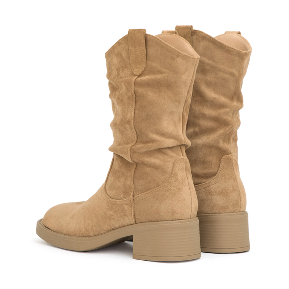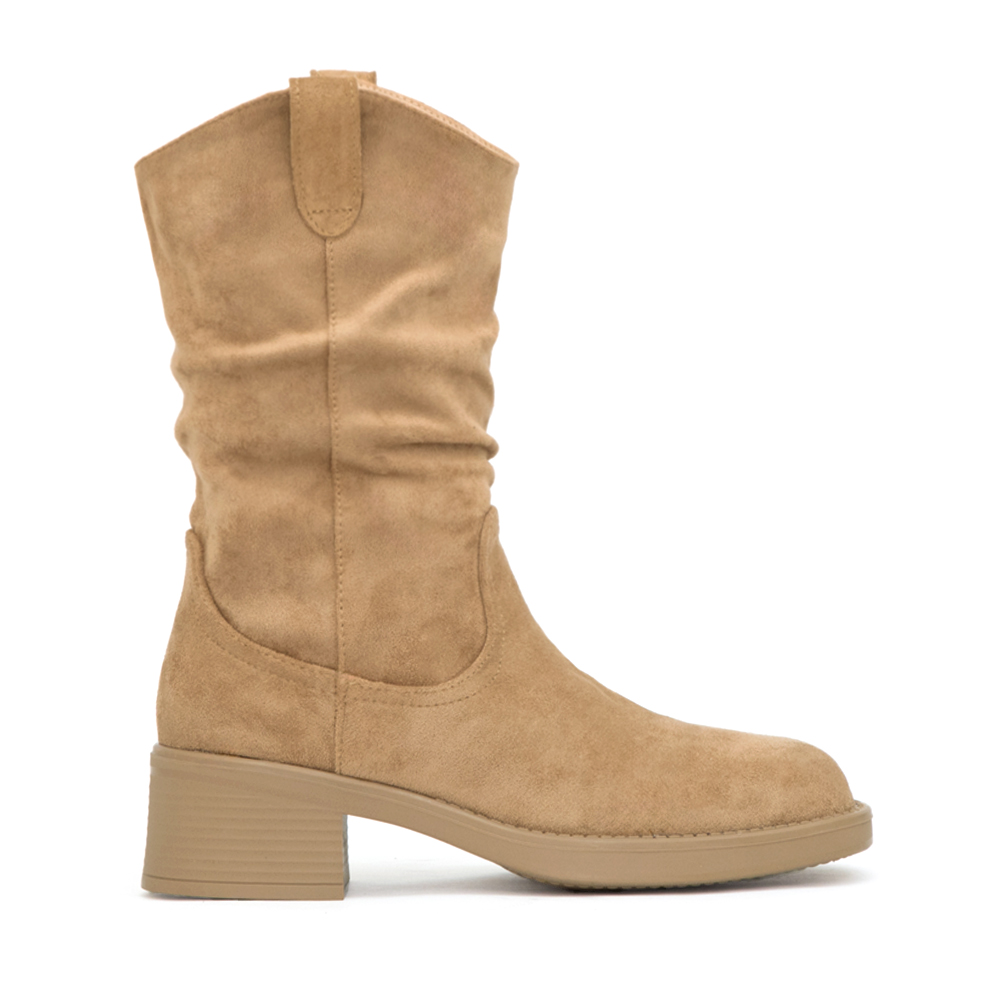 麂皮質感柔軟細膩,小V口設計完美修飾腿部線條。中筒高度恰到好處,不論搭配長版外套或皮夾克都能襯托出腿部線條,實穿與造型兼具。